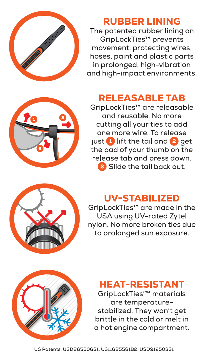Unlike traditional zip ties, they won’t damage wires or surfaces and can be adjusted or reused multiple times. Ideal for automotive, aerospace, and industrial applications, GripLockTies® provide a stronger, smarter, and more secure hold.